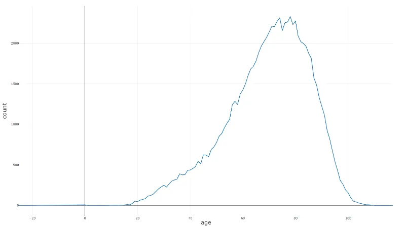 A quick glance at those numbers suggests that, at least when we consider all musicians recorded on WikiData (which is likely to be a fairly comprehensive data set), there doesn’t seem to be a spike at age 27. Still, to be sure, and to see if there are any other anomalies, I figured plotting the full set of numbers on a graph would help. So I searched online for a service that would graph the data for me, if I just uploaded the file I had. A quick google search led me to csvplot.com, which was simple and did exactly what I needed: