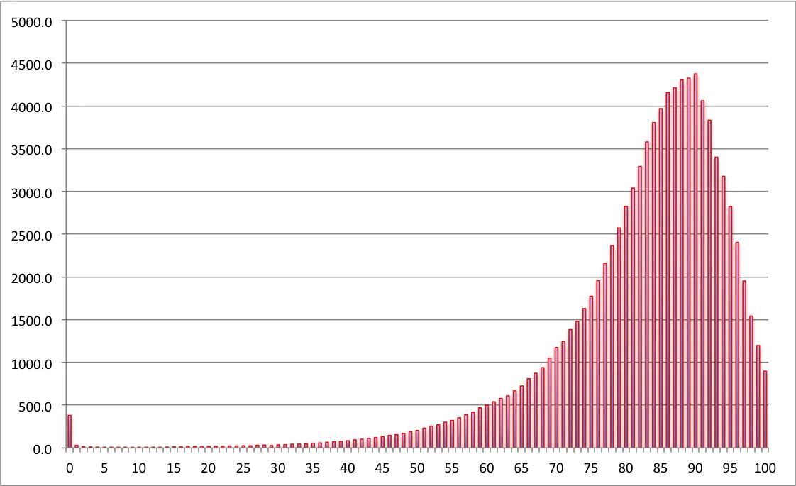 And there we have it. I guess it’s pretty much what we’d expect to see if there’s no special age where artists die more often. There’s a little noise in the line, with the trend starting to go up slowly from around age 15 or 16 (around the earliest you’d expect someone to be considered a musician). The line increases to a peak, maybe something we could even call a plateau, for the entire decade of musicians in their 70s, which sounds about right for the time that a natural death of old age would occur. The graph then declines again, as fewer and fewer people manage to live a long life. (I’m guessing there might end up being a tiny spike at 120 when Keith Richards finally dies!).