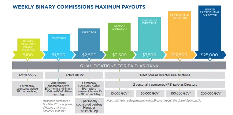 However, to qualify to earn a commission, you need to recruit at least two brand partners under you, aka legs. If you have multiple recruits, you can place them in available positions under other brand partners in your downline. Regardless, one leg must have 660BV (business volume) - the accumulated personal volume of that leg’s downline plus their preferred customers; this is called the strong or power leg. The weaker leg, or confusingly called the profit leg, should have 330BV. Which leg is the strong leg and which is the weak one can change weekly. You can earn $50 each time your legs meet, or cycle, that 660BV:330BV split. If you are a simple commission-qualified brand partner, you can “cycle” twice per week and earn a maximum of $100/week from your downline, as long as they retain their own brand partner status.