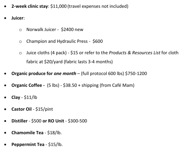 And to add insult to injury, as a final parting gift I found an official Gerson Institute cost estimate (opens as a PDF). This doesn’t look like it was supposed to be found, and could be out of date by now. I note they recommend purchasing a second refrigerator to put the $1,200 worth of organic produce you are going to eat each month!