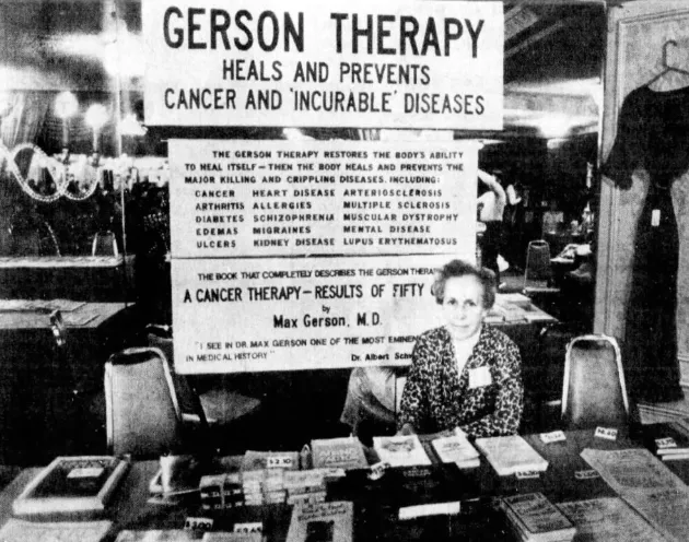 Charlotte Gerson, founder of the Gerson Institute, promoting the cancer therapy invented by her father at an alternative medicine fair in Los Angeles. Albuquerque Journal, Nov. 30, 1987