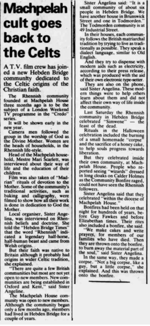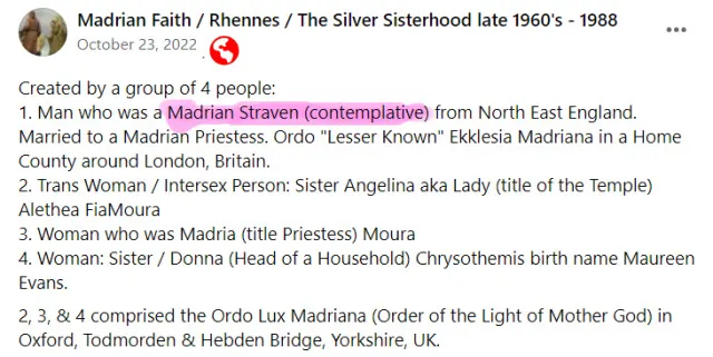 It is unclear when Mary Guillermin (then Mestre Mari Scarlett) became involved. However, once the Madrians relocated to Hebden Bridge in West Yorkshire, by the early 1980s, she was interviewed with greater frequency and appears to have become something of a permanent spokesperson.