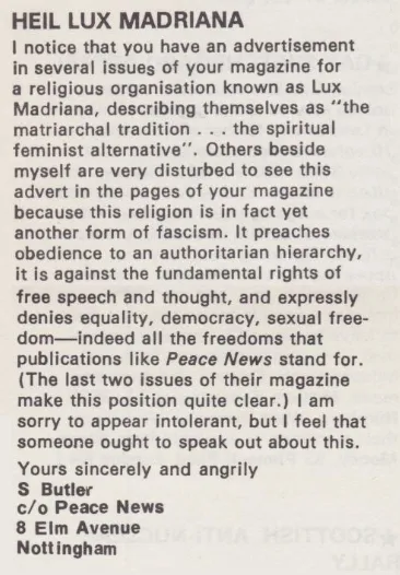 But even at this early point in the group’s history, there is evidence that the group was not welcomed with open arms. Accusations of the group being a cult (as above), and even practising a form of fascism, can be found - as seen in this piece from the Peace News, a pacifist magazine: