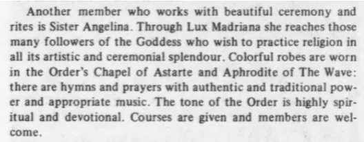 Priscilla (going by Sister Angelina at this time) is mentioned/featured far more frequently in articles about Lux Madriana from the late 1970s. In my opinion, she is presented as a spokesperson, or even the spiritual leader of the group, in these early articles.