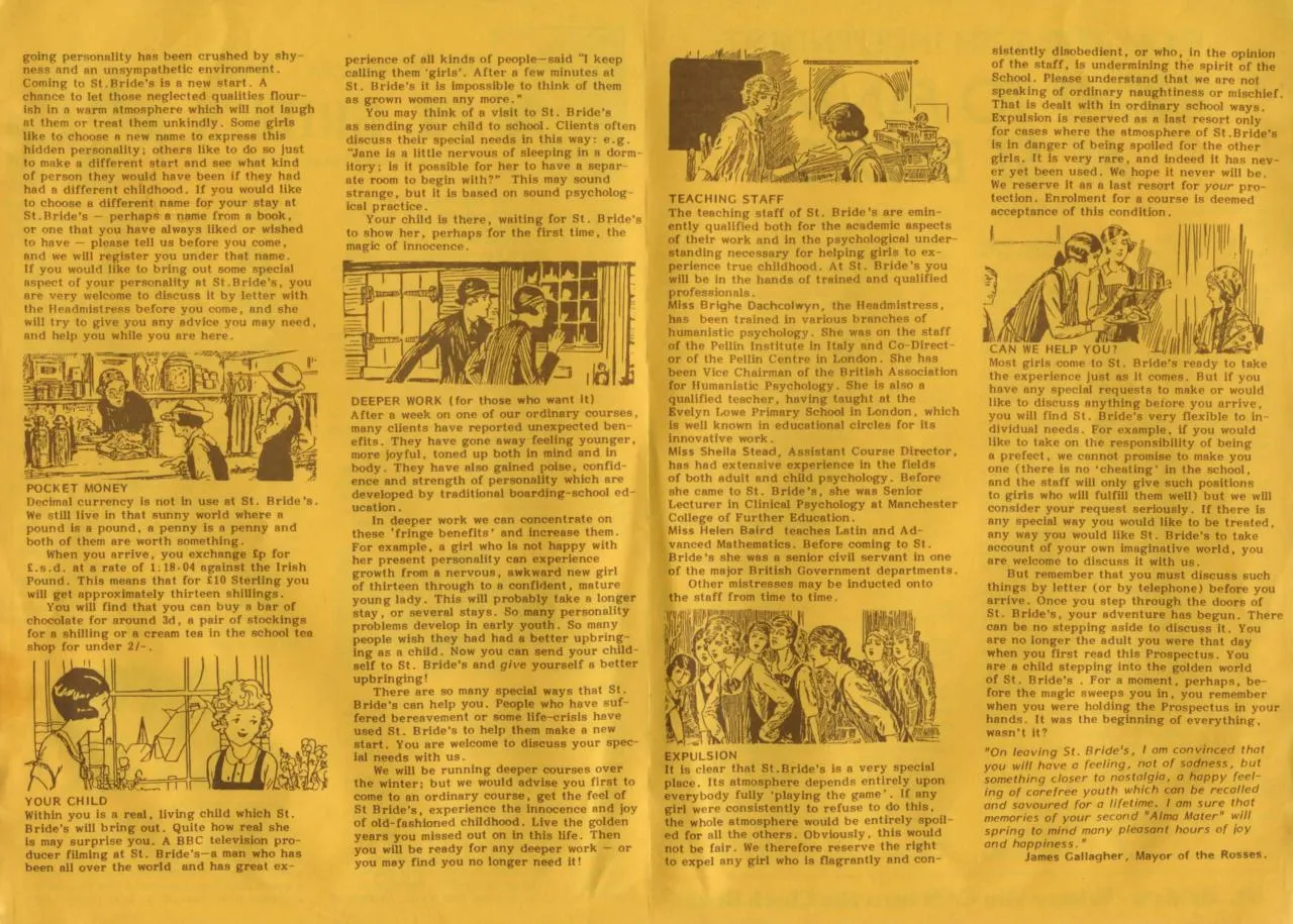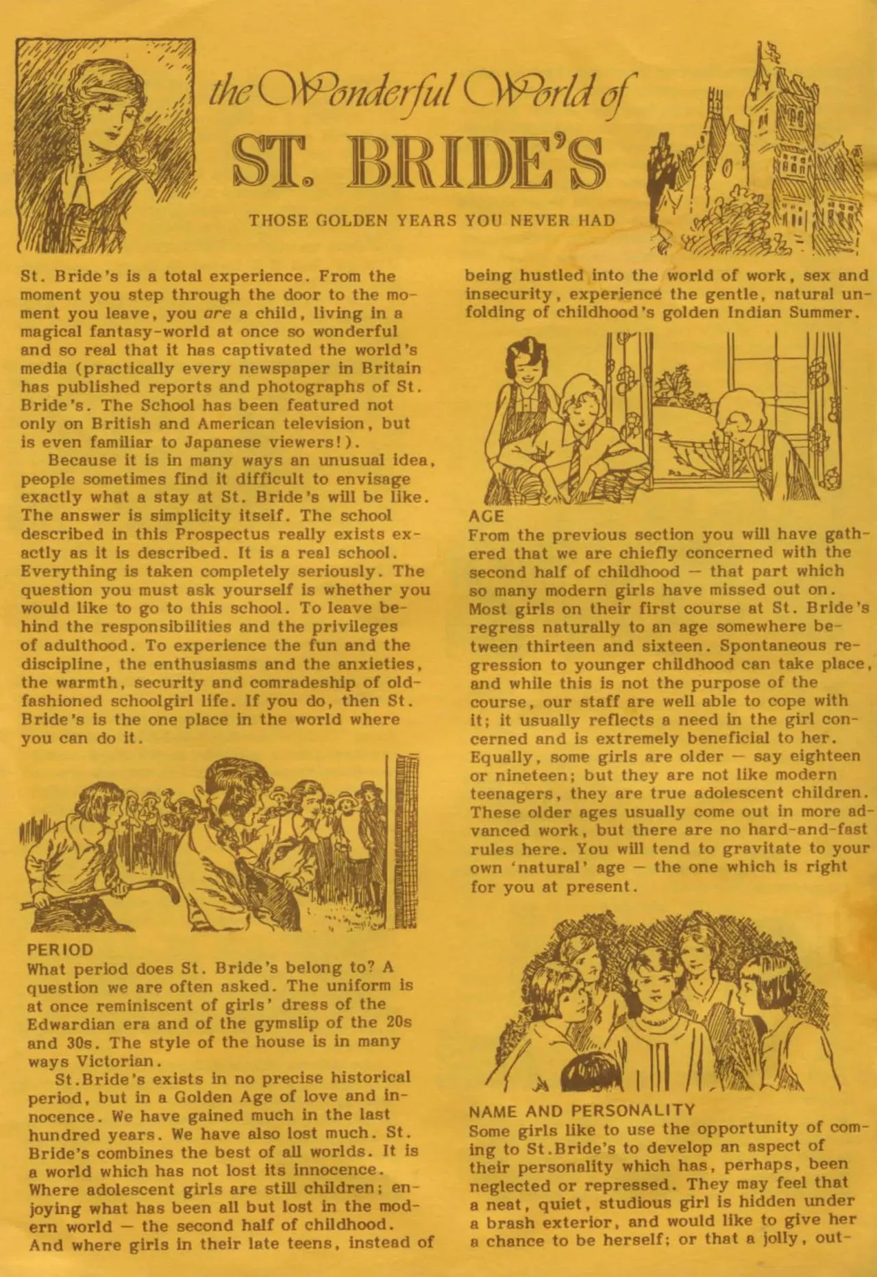 St. Bride’s was a £95 per week alternative holiday experience for adult women who wanted to pretend they were attending a traditional English boarding school, complete with Latin classes and discipline (and while there was no caning on the ordinary course, a deeper course was available where it may have been a possibility).