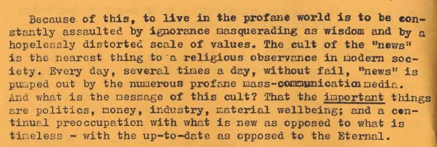 The solution? To limit the profane influences in our lives, cut down on our participation in the “cult” of the news, and reduce dependence on commercial media. Instead, Madrians were encouraged to build their own tradition of storytelling and songs. In the first instance this is information control, but my second thought is that such advice should have been a red flag that the traditions claimed by Lux Madriana were not as ancient as they had claimed.