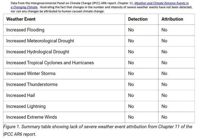 Climate activists and others in the climate industrial complex have claimed that we are experiencing more extreme weather. These claims have been rejected, even by the political/ideological Intergovernmental Panel on Climate Change. If any of your members were to read and understand the Intergovernmental Panel on Climate Change (IPCC) AR6 report, Chapter 11 on Weather and Climate Extreme Events in a Changing Climate, they would see the following summary chart: