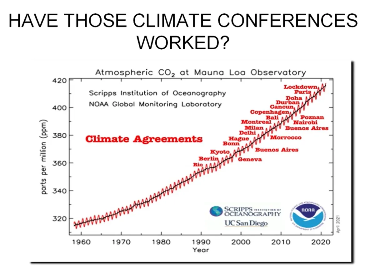 Next John maps climate agreements against measurements of CO2 in the atmosphere, showing that none of the agreements have stopped the rise of CO2 levels: