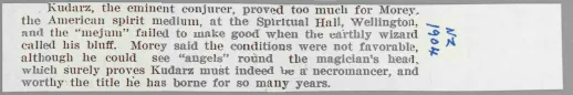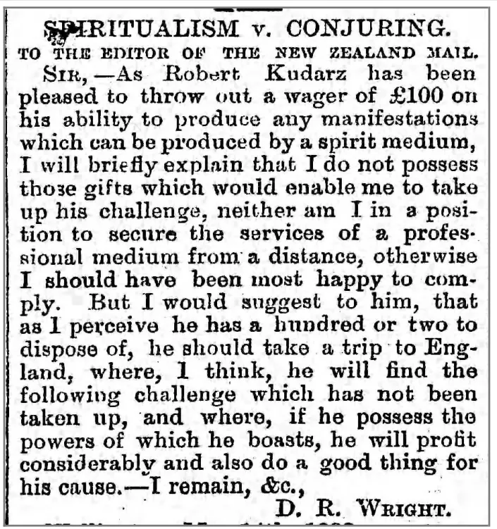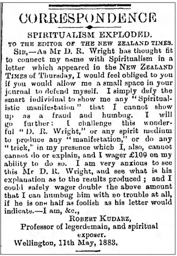 Within two months of his arrival, Kudarz also issued a wager. In the New Zealand Times, Kudarz wagered £109 to any smart individual who could show any spiritual manifestation that he could not prove to be fraudulent.