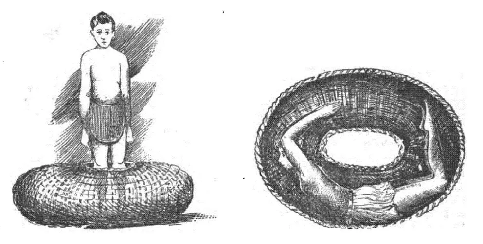 According to Wikipedia, the secret to this trick was revealed by Samri Baldwin in 1895. Normally, the assistants would coil themselves around the sides of the basket, with the sword inserted into prearranged slots. If the child reappeared in the audience, it would not be the child in the basket, but a different child altogether. The second child seen in this act is unlikely to be Kudarz’s other children, as Harry Washington Kudarz would have just been about one year old, and their second son, Leslie William Le Roy, would not be born until a decade later.