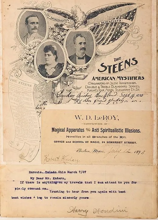 Whether W. E. White ever provided MUM with the news articles he promised is unknown, and the last known location of Kudarz’s scrapbook is known, but it is possible for New Zealanders to view it (although not in colour). In 2006, the scrapbook was lent to the National Library for copying, along with a series of scripts on magic compiled by ‘Billy’ White for the ZR Nelson radio station. At the time of copying, the scrapbook was privately owned but had previously been in the collection of the Wellington Magician’s Society. In 2017, the scrapbook had made its way to an Illinois auction house as part of a wider auction of magical paraphernalia. The scrapbook contained clippings, letters, postcards, etc., that were signed by various magicians, including a typed note from Houdini. The catalogue (see page 92) listed an expected price between $2,500 and $3,000, and eventually sold for $4,800. Whether other items of Kudarz were included is unclear, but an autographed picture of Houdini with an inscription to Billy White was also included (see page 76 of the aforementioned catalogue). The current location of either of these objects is unknown.