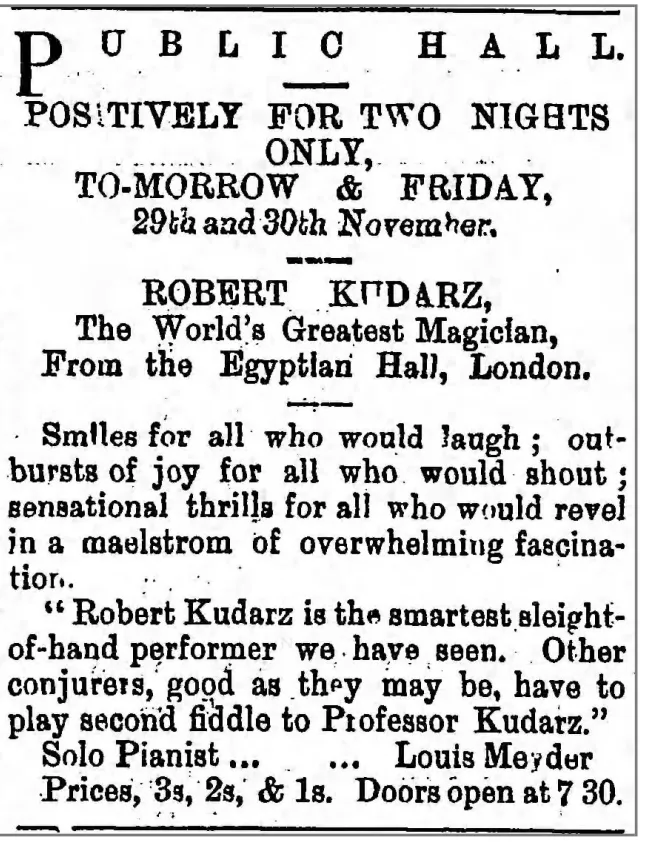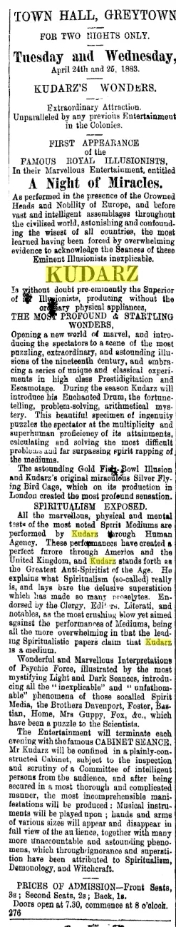 The first mention of Robert Kudarz that I’ve been able to locate comes from New Zealand newspapers in 1883, when the Wairarapa Daily Times announced the arrival in Wellington of Messrs Kudarz and Verno, illusionists and anti-spiritualists. This date seems to be confirmed by Kudarz himself in the posthumous publications of his serial in MUM. Soon, Kudarz was performing in shows and making his opposition to spiritualism known: