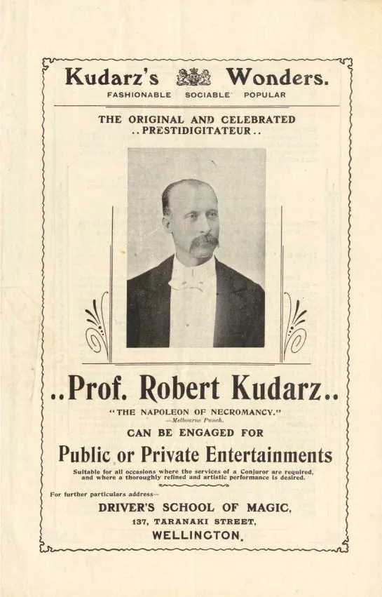 Death is an odd place to start this story, but it is the best point to compile what was commonly known of Kudarz’s early life. Thomas died at the age of 65 on December 5th, 1922, 3 days after his son’s wedding. While no standard obituary was published, his life was summarised in the Otago Daily Times and New Zealand Times with the following information in one form or another. He was born in 1857 in Paddington, New South Wales, but has been called a Wanganui boy in some articles. For his day job, he worked as a compositor for the Government, and for publications such as The Freelance, The New Zealand Times, The Evening Post, and an establishment in Whanganui. He learned his trade from the late John Balance, but became enamoured with conjuring in the 1870s when he first took lessons from a Professor Hazelmeyer. He would go to the grave being known as a magician, as well as an opponent of spiritualism. At the time of his death, he had two grown sons who lived in Wellington and a married daughter in Christchurch.