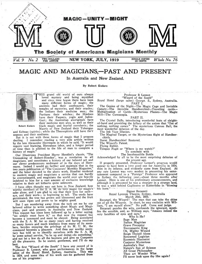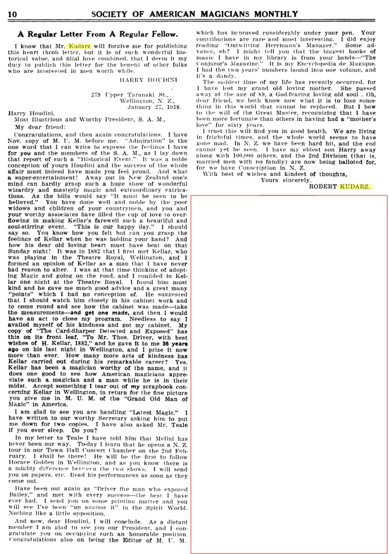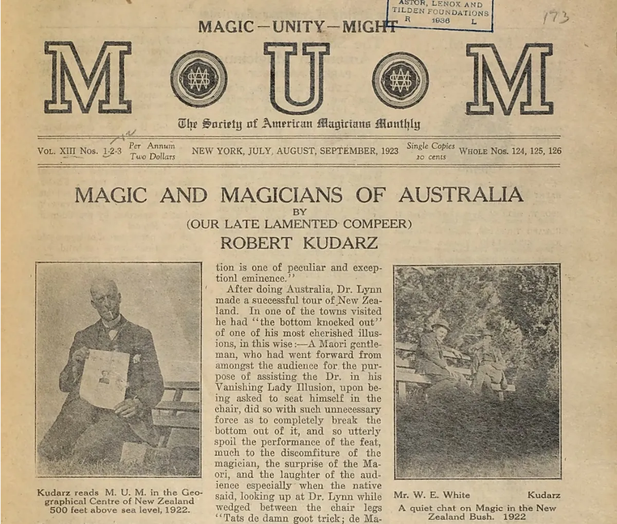 Driver joined SAM in 1904 and was member number 167. He was a regular correspondent of SAM’s monthly magazine, MUM (Magic Unity Might), from 1919 to 1923 (when several articles were published posthumously). Under his Professor Kudarz persona, he published detailed histories of magicians who performed in New Zealand and Australia from the 1800s to the early 1900s. He wasn’t necessarily a modest man, as he included his own history at what would be the unexpected end of the series. However, whether this was an error with MUM’s typesetter or with Kudarz’s, some of the dates he includes do not match newspaper records. As it happened, Harry Houdini was both the President of SAM and the editor of MUM during the period of Kudarz’s writing. Looking at the correspondence that was published in MUM and elsewhere, it appears to be a relationship of mutual respect.