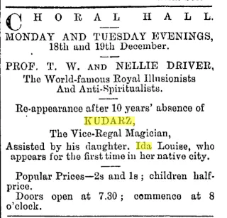 They toured Australia and New Zealand between 1888 and the 1890s. Their young daughter, Ida (who is alternately named in advertisements and reviews as Ida Louise Maude Driver or Ida Tansie Kudarz) started to perform alongside her parents in 1890, at the age of 4. One trick, called Hindo [sic] Basket Trick (also known as the Indian Sword basket) is a centuries-old trick that is still performed today, but it demonstrates how Ida, like many children of vaudeville families of the time, was part of the family business: