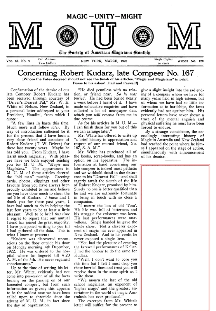 In the March 1923 issue of MUM, a W. E. White of Nelson, NZ, provided more details of Kudarz’s passing. He had been found unconscious outside his door on December 4th, and died in the hospital early the next day. White claimed that Kudarz was penniless and without friends or family near, and his description of the late magician hints at a complex life: