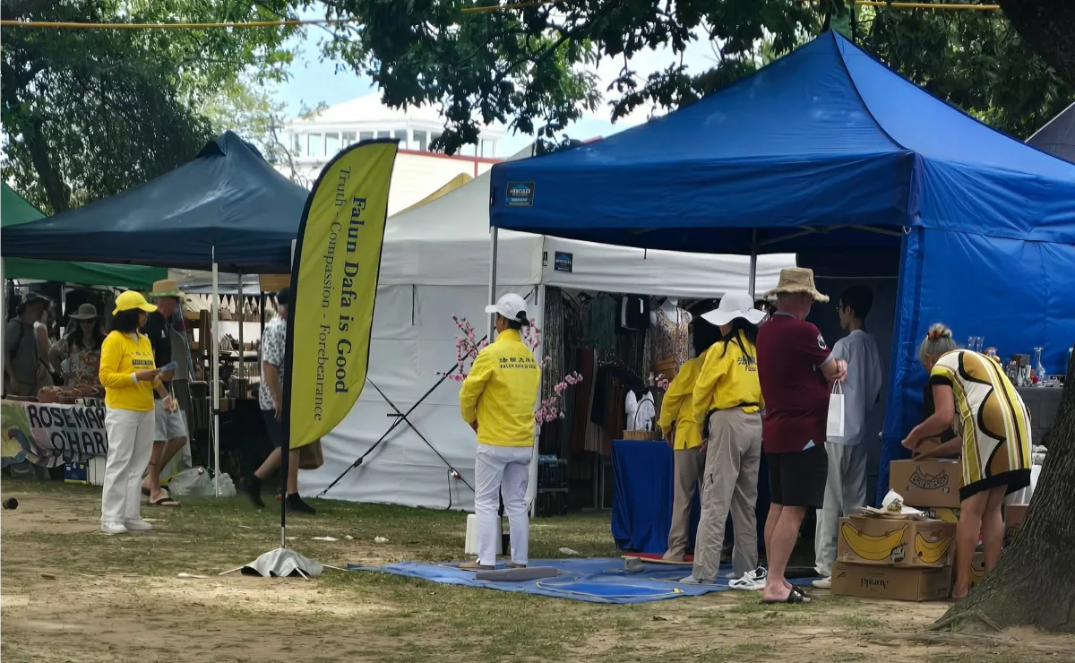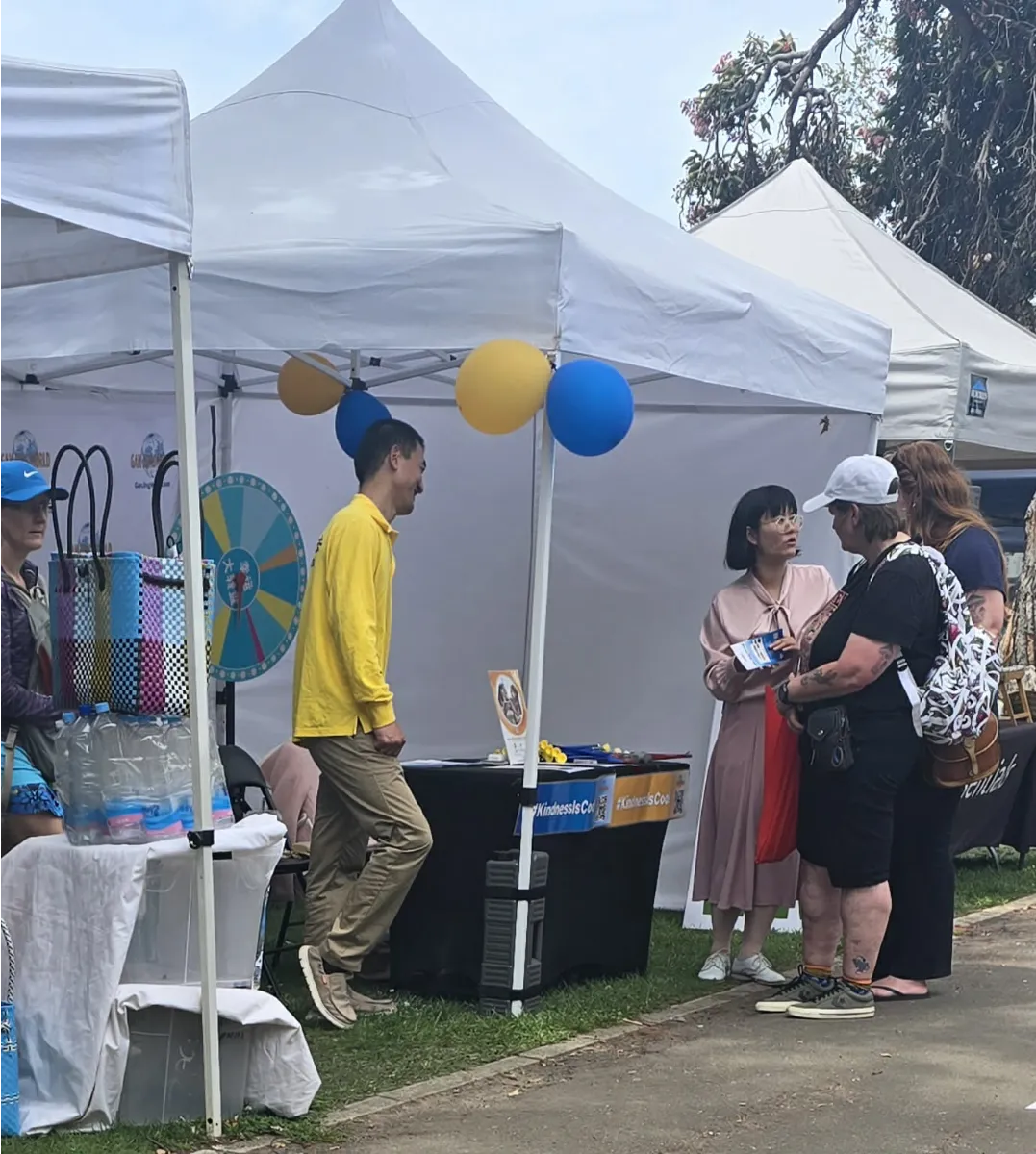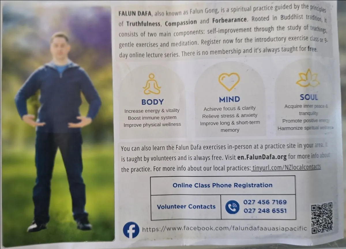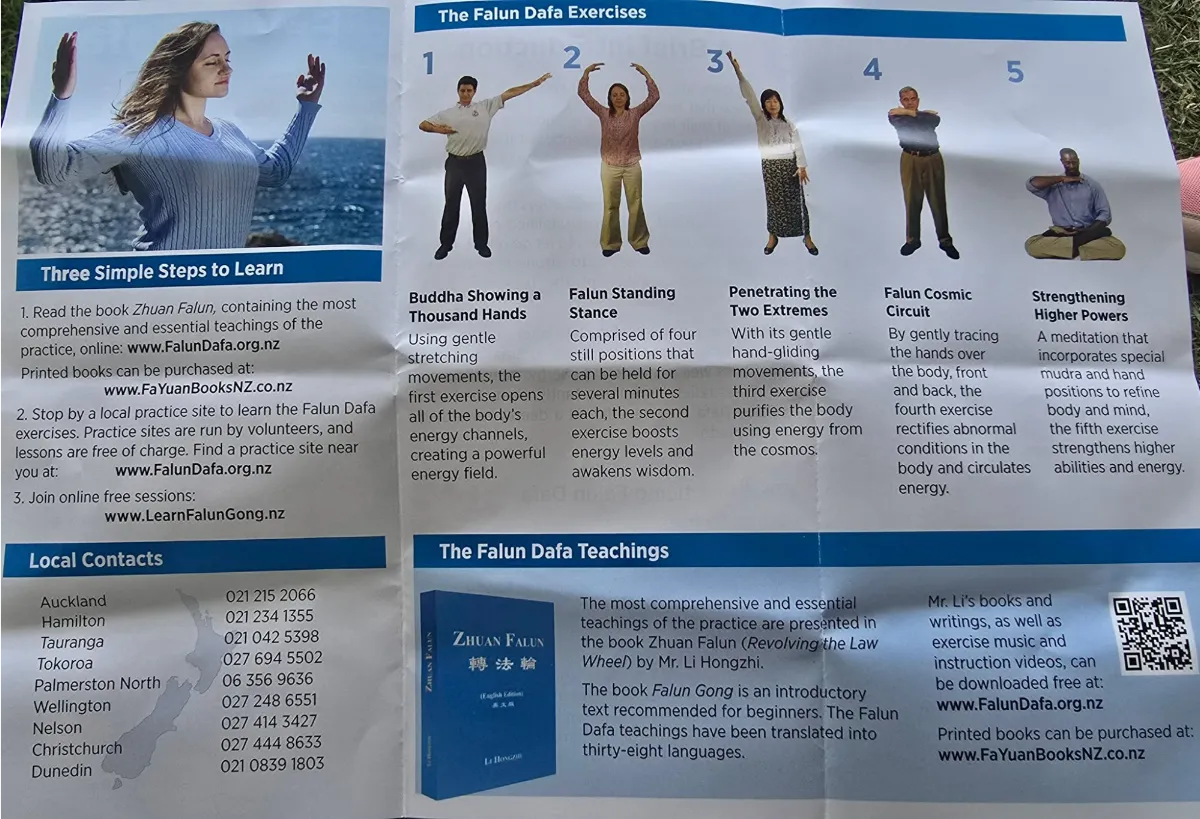 I decided to chat with each Falun Gong stall and record what they had to say. The first stall had a couple of people meditating, with one lady speaking to me saying it was Chinese meditation, and handing me the same flier as last time. “You can feel the energy through your body”, and it’s “easy and very powerful”, she explained. We spoke for a few minutes, and she said I should visit their website to download their videos. She invited me to join their meetup group, which had nine locations around the country, but “sadly” didn’t support Tarranki - I’d have to learn online. She then handed me another flier.