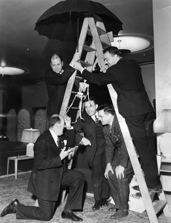 “Judge Robert Dunne, Judge Rudolph DeSort and Joe Triner are under a ladder while Atty. Robert Cantwell and Eugene Dunne hold an umbrella above on Friday the 13th in 1940. The group was at the 13th anniversary dinner for the Anti-Superstition Society, held at the Merchants and Manufacturers Club” Chicago Tribune