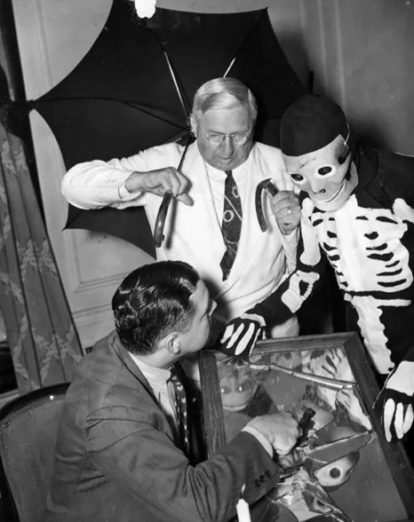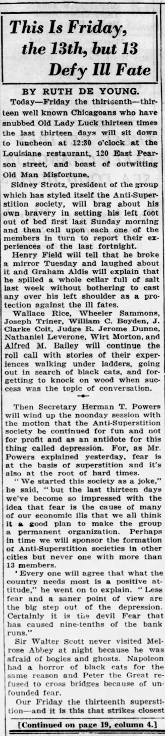 “Nothing could keep members of the Anti-Superstition Society from holding their annual dinner at Chicago on Friday the 13th in 1937. Even the presence of a skeleton was no jinx, nor was Gen. Anton F. Lorenzen, who held an open umbrella over his head, or the antics of Joseph Triner, state boxing commissioner, who defied every jinx by smashing a mirror.” Chicago Tribune