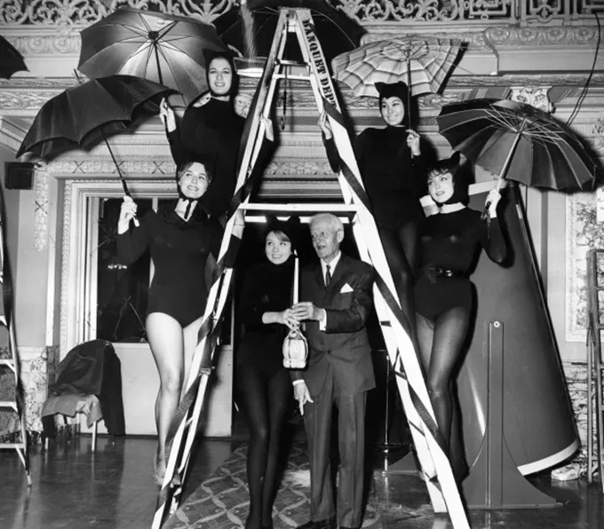 “Bernadine Stevens, Judy Kurtz, Patty Allen, Tani Sawa and Connie Jean are with Nathaniel Leverone, founder of the Anti-Superstition Society, as he enters the Gold Room under a ladder at the Pick Congress Hotel on Dec. 13, 1963, in Chicago.” Chicago Tribune
