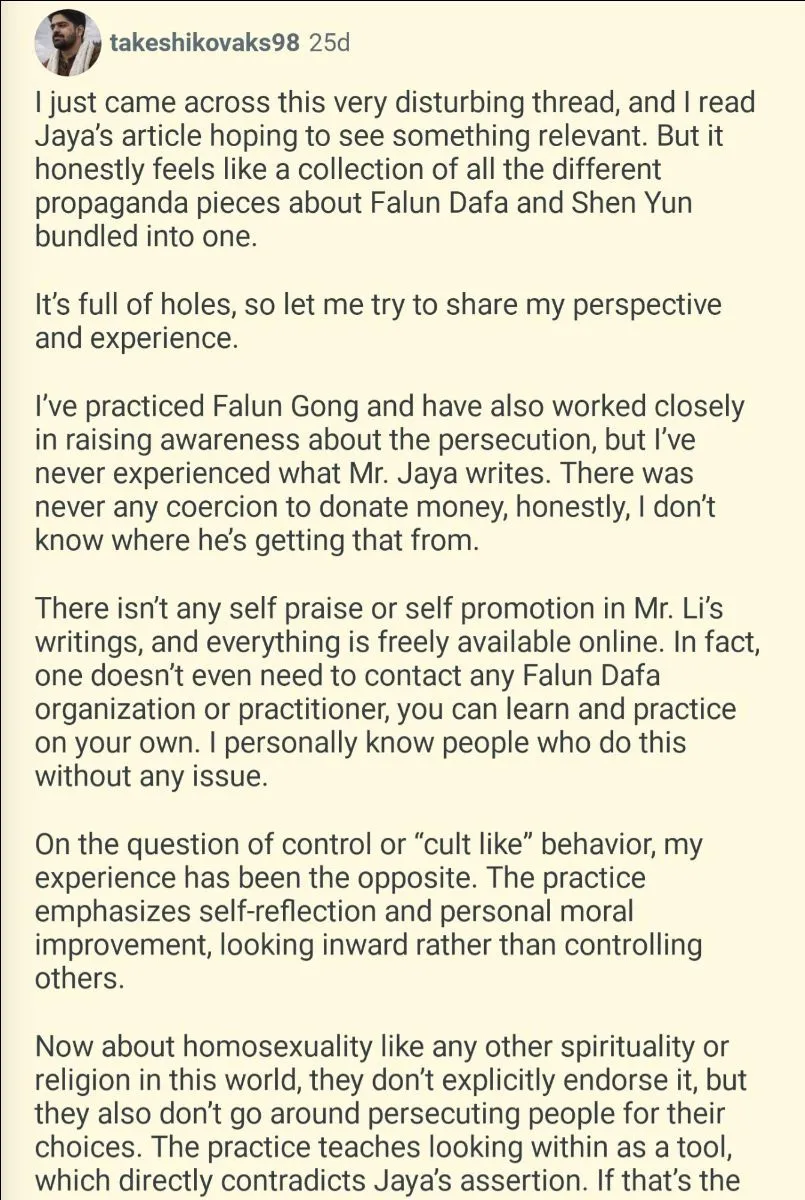 The members who didn’t ignore me seemed to have very little compassion, responsibility, or even acceptance of any harm that I or others mentioned their religion had caused. It was like pulling teeth to get them to admit that anything had gone wrong, but they would never blame the religion. It was always the fault of something else, or just a “small problem”. I was continually blamed for showing the religion in a negative light, and never sharing any positives. They mentioned the CCP (more times than I could count) if they didn’t like certain negative comments, or if the papers were straight-up misinformation (and they would use their “The Epoch Times” news site - a mouthpiece for Falun Gong). I was accused of being paid for my posting by one member (although that person eventually deleted their own comment), another suggested I may have been paid, and one constantly repeated that I wasn’t discussing in “good faith.”