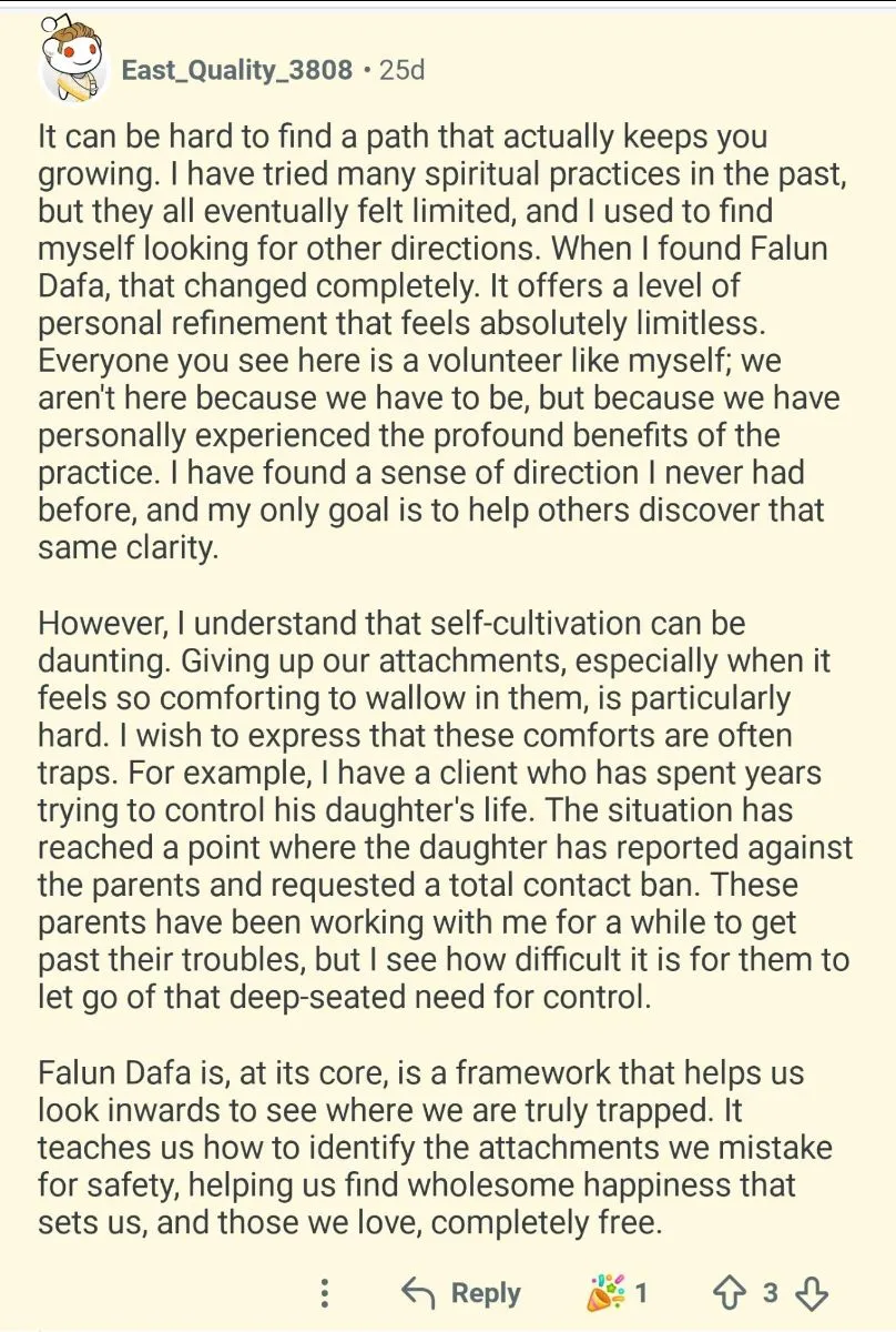 The first posts from Falun Gong on my Reddit thread were weird; they all wrote in perfect, long paragraphs, like someone had checked them over. They didn’t really address the harm I brought up; they only said the religion was a good fit for them. All but one member was not from NZ, yet they were commenting in a NZ group they had never commented in before. I questioned whether it was coordinated damage control, but the ones who answered me just said they came across the post. The one from NZ had their account banned a few days later - I have no idea why.